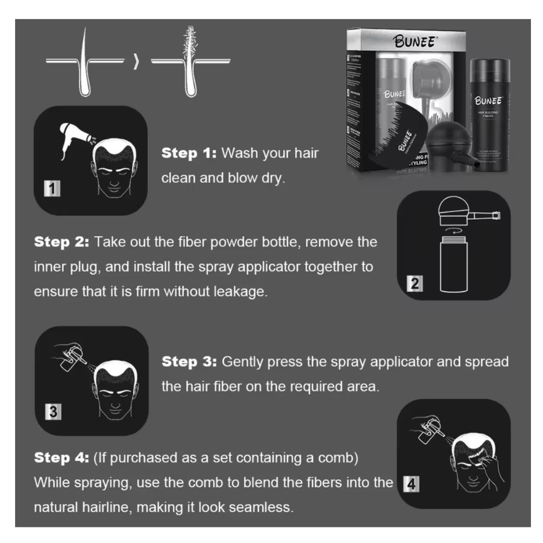 If thinning areas, sparse spots, or a softer hairline affect your confidence, hair fibers are a fast, cosmetic way to upgrade your look. BUNEE Hair Fibers are made to attach to your existing hair strands using electrostatic technology, helping create the appearance of instantly thicker-looking hair with seamless coverage.